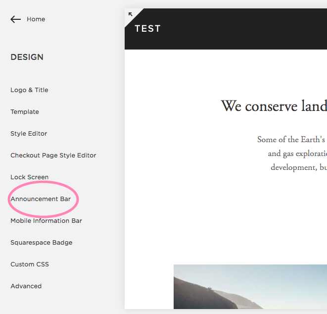 Step 8: Squarespace gives you the opportunity to have an announcement bar on your website. You can see my announcement bar below. I experiment between having my freebie marketing guide in the announcement and having a call to action to contact me.